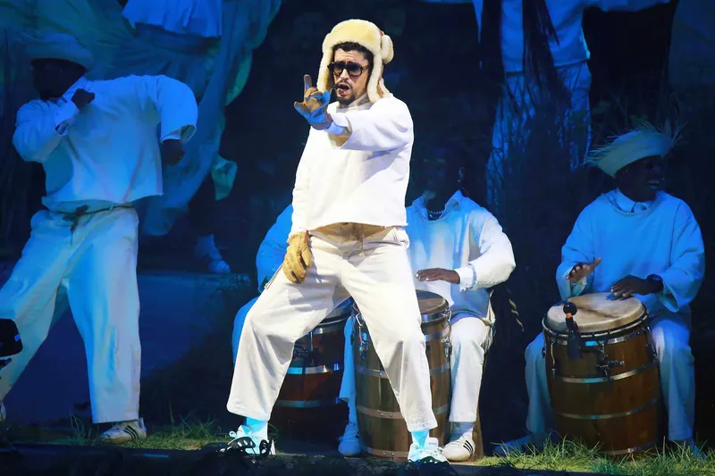 Climbing a towering platform, Bad Bunny unleashed his 2022 breakthrough "El Apagón," before closing the historic performance with two tracks from his Grammy-winning album DeBÍ TiRAR MáS FOToS: "CAFé CON RON" and the emotional finale "DtMF."
