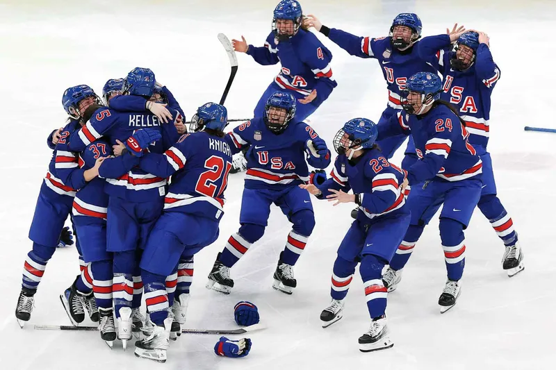 The U.S. women's hockey team celebrates their gold medal, a triumph clouded by political controversy. Sarah Stier/Getty