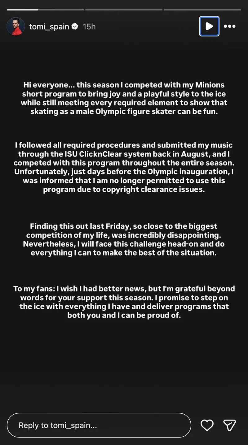 "This season, I performed my Minions short program to add fun and a lighthearted touch to the ice while still hitting all the technical marks to prove that men's Olympic figure skating can be enjoyable," Sabaté wrote in an Instagram story post on Sunday, revealing the shocking setback.