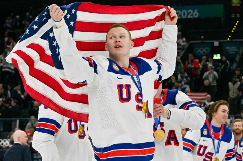 Brady Tkachuk celebrates Team USA's historic gold medal win at the Milano Cortina 2026 Winter Olympics—a moment now overshadowed by AI controversy. Alexander NEMENOV / AFP via Getty